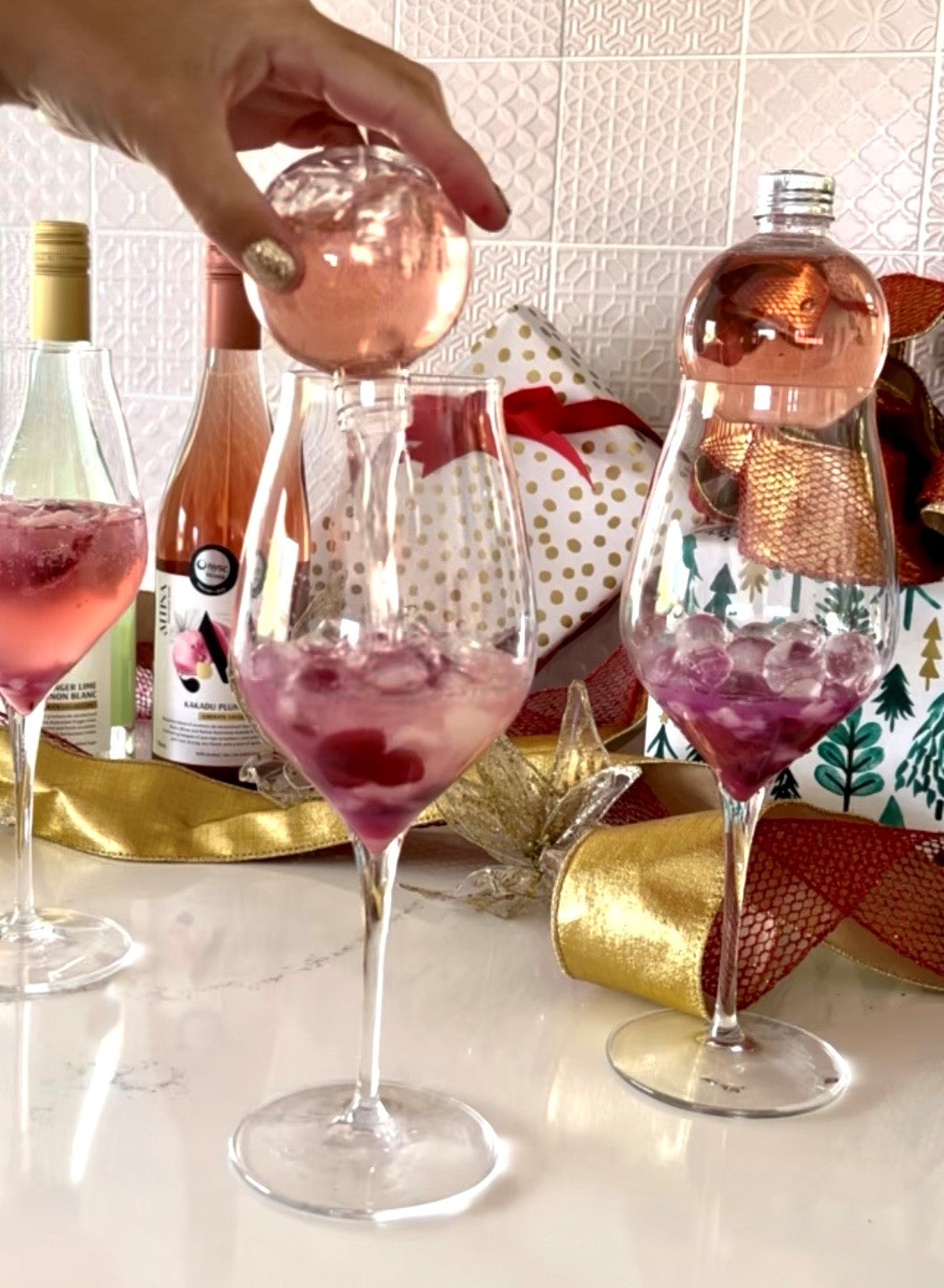 Fill the wine glass with the ice balls, pop in a garnish and place the liquid bauble on top of the glass.