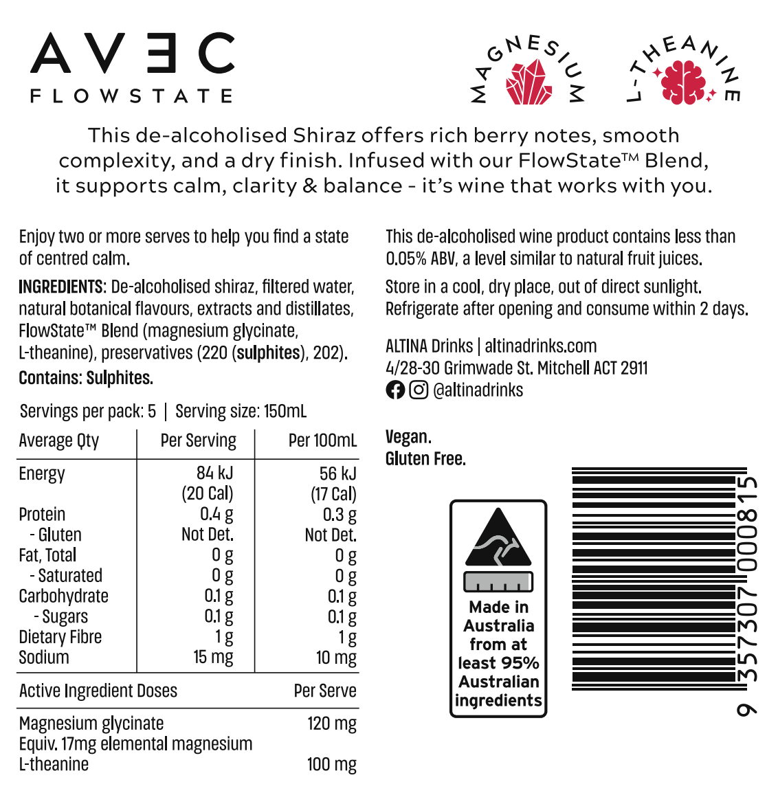 Shiraz: De-Alcoholised Shiraz, natural botanical flavours, extracts and distillates, FLOWSTATE® Blend (magnesium glycinate, L-theanine), preservatives